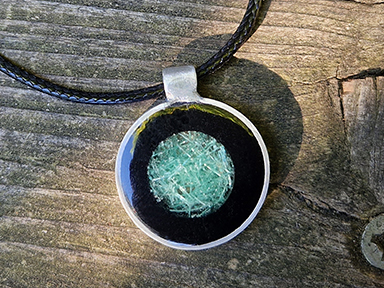 Sehr schickes „Auge“ in die Tiefsee. In der Mitte, in dunkles Resinharz eingegossen, befindet sich eine geometrische Form wie Kreis, Raute oder Dreieck, in die wiederum Strandgut eingeschlossen ist. Sehr aufwendig in vielen Arbeitsschritten hergestelltes Accessoire mit gebürsteter oder polierter Aluminiumfassung mit angelöteter Öse. 28 mm Durchmesser mit 1 mm Wandstärke.
