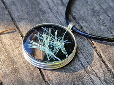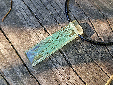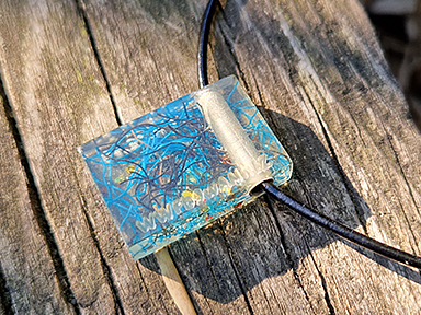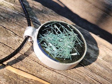 Rundes Amulett mit einem Durchmesser von 25 mm, kunstvoll eingefasst in feinem Silberdraht. Im Inneren sind Fragmente eines Fischernetzes wahlweise in klarem Resinharz oder vor dunklem Hintergrund eingegossen, bei dem sich das Strandgut vom Hintergrund erfrischend abhebt und eine Ästhetik der 20er Jahre verbreitet. Das Amulett ist in verschiedenen Farben erhältlich. Der Spenden-Code und die Geokoordinate sind konzentrisch auf der Rückseite des Amuletts eingraviert.