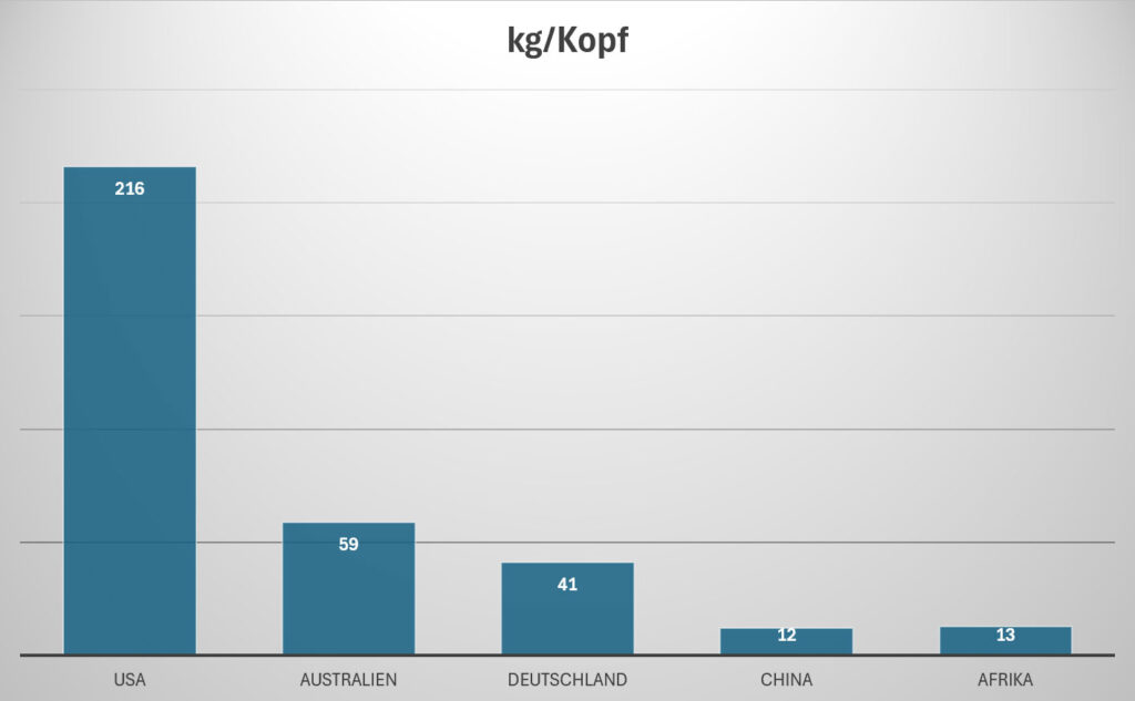 Der Pro-Kopf-Verbrauch variiert stark je nach Region und Wohlstand: